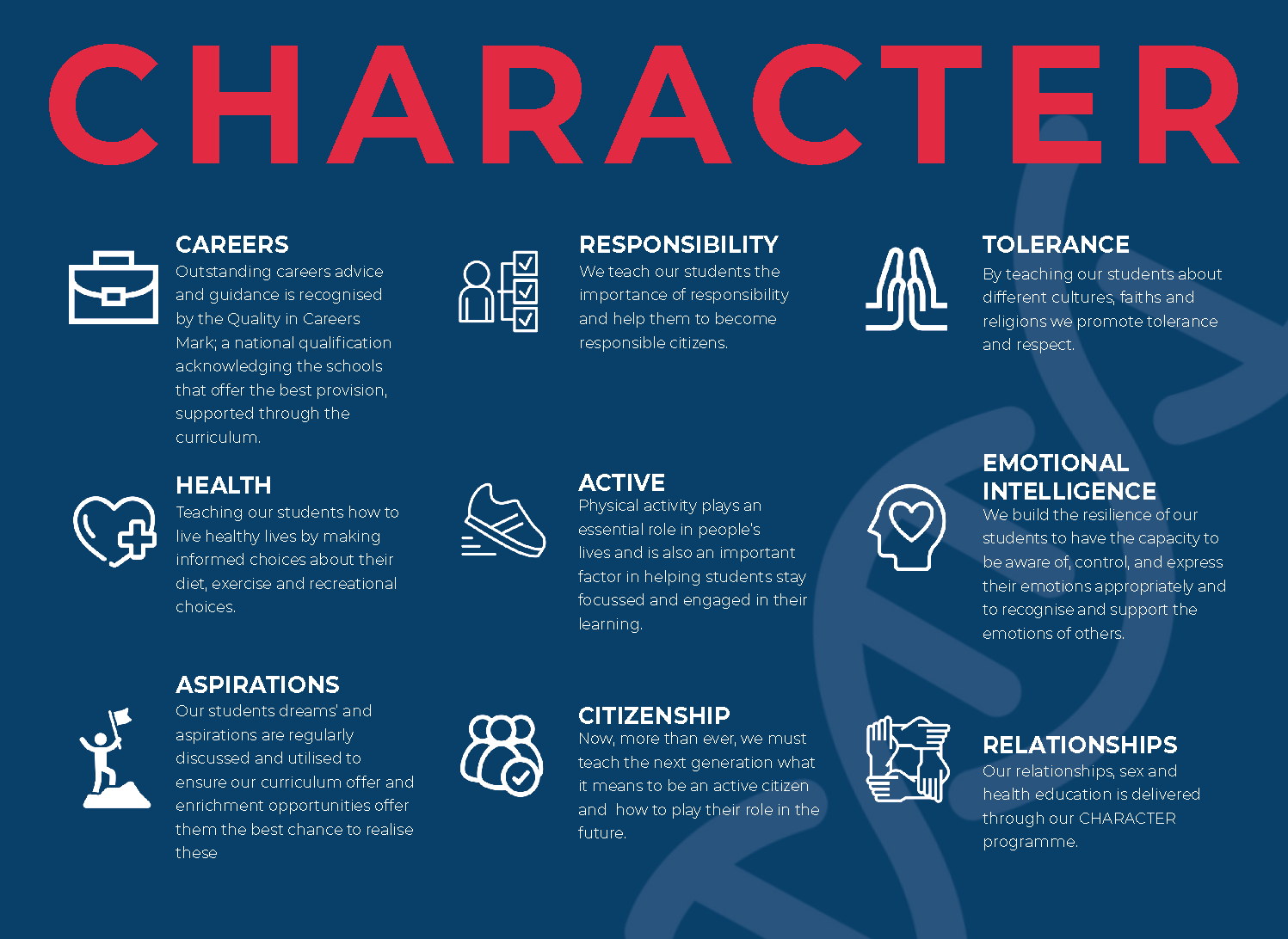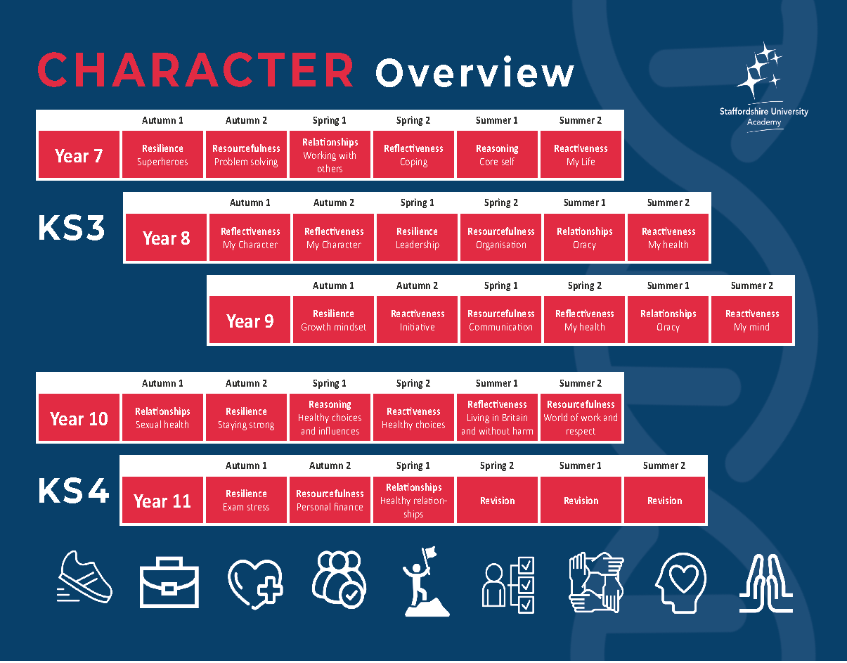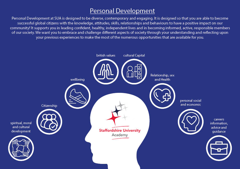 At the very centre of our academy, stands a powerful commitment to the outstanding personal development, care and guidance for all our young people. One of the greatest strengths of this academy has always been its pastoral care and that, alongside of there being a strong sense of community here – of togetherness, of shared opportunities – means that our students are able to flourish in all the other aspects their lives. We ensure that every member of our academy community knows that we are committed to supporting their physical health, safety, and emotional wellbeing throughout their journey with us. At SUA this commitment is delivered through form time activities, assemblies, CHARACTER lessons, extracurricular activities and pastoral support. We ensure that students take part in a well planned and sequenced programme to ensure they are committing age-appropriate knowledge to memory. Students are encouraged to develop their individual character, learn how to stay safe and healthy, and develop knowledge to ensure they are well equipped for the future.